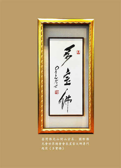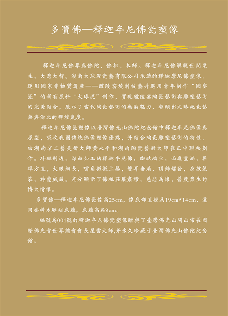 釋迦牟尼佛瓷塑像以臺灣佛光山佛陀紀(jì)念館中釋迦牟尼佛像為原型,吸收我國傳統(tǒng)佛像塑像優(yōu)點(diǎn),并結(jié)合陶瓷雕塑藝術(shù)的特性,由湖南省工藝美術(shù)大師黃永平和湖南陶瓷藝術(shù)大師崔正中聯(lián)袂創(chuàng)作。玲瓏剔透、潔白如玉的釋迦牟尼佛,跏趺端坐,面龐豐滿,鼻準(zhǔn)方直,大眼細(xì)長,嘴角微微上揚(yáng),雙耳垂肩,頂飾螺發(fā),身披袈裟,神態(tài)威嚴(yán)。充分顯示了佛祖莊嚴(yán)肅穆,慈悲為懷,普度眾生的博大情懷。該尊釋迦牟尼佛瓷雕種模像由臺灣星云大師開光并題寫《多寶佛》贈予湖南大球泥瓷藝有限公司。釋迦牟尼佛瓷像高26cm,底座選用香樟木雕刻為蓮花座。星云大師為釋迦牟尼佛瓷塑像題寫的墨寶《多寶佛》2014年5月30日董事長滕召華向臺灣佛光山開山宗長星云大師捐贈編號為001號的《釋迦牟尼佛瓷塑像》和李自健先生原創(chuàng)的《春滿人間》雙面瓷板畫及珍貴的大球泥原料