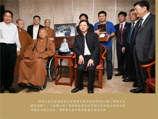 董事長滕召華拜訪中國佛教協(xié)會副會長兼秘書長、湖南佛教協(xié)會會長、麓山寺方丈圣輝法師,并親手將046號《多寶佛》釋迦牟尼佛瓷塑像捐贈給圣輝法師、永久收藏于麓山寺。
