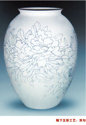 裝飾紋樣結(jié)構(gòu)嚴(yán)謹(jǐn),造型簡(jiǎn)練。不輕佻、不淺薄,不矯揉造作,給人莊重、大氣的美感,藝術(shù)上十分耐人尋味,使人親近。醴陵釉下五彩瓷這一獨(dú)到風(fēng)格的形成,與它特有的那種雙勾汾水彩飾技法有著密切的聯(lián)系!半p勾汾水”是醴陵釉下五彩的精髓,也是醴陵釉下五彩的秘笈。彩繪中先用線條勾勒?qǐng)D形輪廓,再以汾水法填以色彩。勾線表現(xiàn)出高超的技巧,使之富有濃厚的裝飾特征。所勾出來(lái)的墨線和色線十分奇特,色線根據(jù)預(yù)設(shè)的顏色燒成后呈現(xiàn)鮮艷的色調(diào),墨線則在一定溫度下消失,呈現(xiàn)空白線條。汾水則不僅要求色彩平坦,并且要呈現(xiàn)出多種層次,因而要運(yùn)用罩色與接色等多種技法。