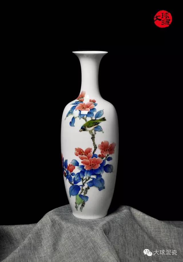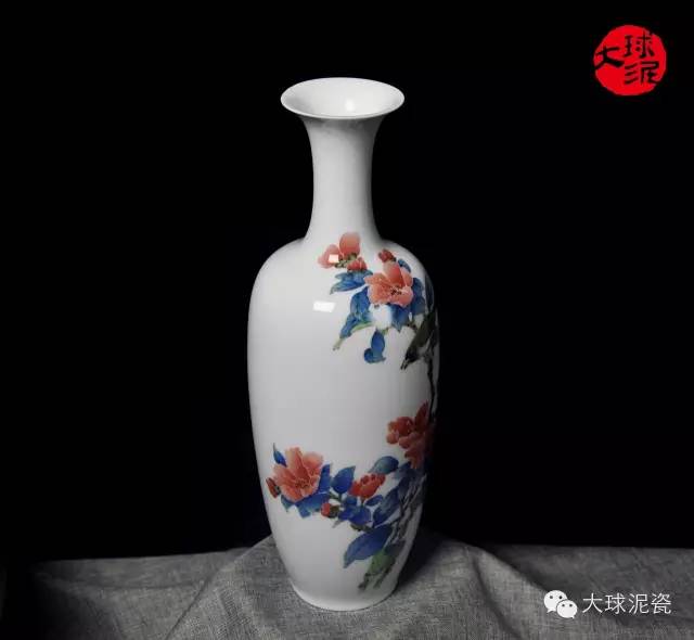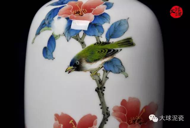 《鳥語花香》柳葉瓶,以大球泥為原材料,由工藝美術(shù)大師李璜香創(chuàng)作。釉色光亮純凈,潔白泛青,畫面典雅清新,極具中國傳統(tǒng)手繪之神韻。此件大球泥瓷,采用國畫中常見的花鳥題材進(jìn)行創(chuàng)作,畫面布局疏密有致,有動有靜,筆墨韻味更勝于紙質(zhì)畫作,體現(xiàn)出作者深厚的繪瓷功底。