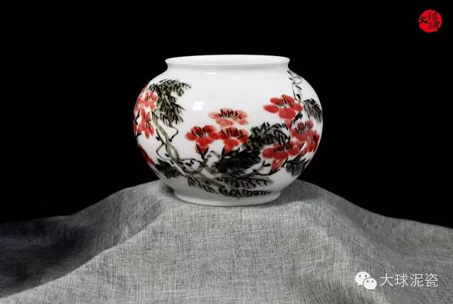 綠蔓如藤不用栽,淡青花繞竹籬開。 披衣向曉還堪愛,忽見晴蜓帶露來。 ——陳宗遠(yuǎn)·《牽;ā 作品介紹 《壯志凌云》小瓷罐,描繪著一副在深秋的傍晚,紅艷艷的牽;ㄨ簿`放的情景。瓷罐上紅艷的牽牛花和含苞的花蕾,點綴在以濃墨勾畫的枝葉藤蔓上,不僅映襯出牽;ǖ膵擅,也令畫面更具層次感。一群從遠(yuǎn)處飛來的雀鳥,使得畫面活潑生動,令人感受到在這深秋蕭瑟的景色中,仍感覺到生命的活力。 從造型上來看,《壯志凌云》小瓷罐,圓身鼓腹,沉穩(wěn)而古樸,使得整件作品顯得更為高挺,其屹立之姿威武而雄壯。而瓷罐上描繪著在深秋的傍晚,一叢叢紅艷艷的牽;ㄓL(fēng)霜露盛開,其本意為不肯屈服現(xiàn)實的殘酷,以一種獨立、堅強、自信向人們展示的豁達(dá)之美。