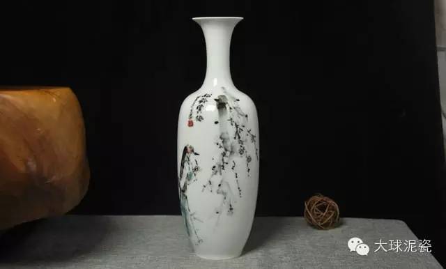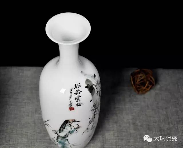 寒冬臘月,天寒地凍,大雪紛飛,天地間唯有梅花傲骨錚錚,凌寒獨放。也許是窗外的這一樹梅花盛放得太熱烈太激昂,引得屋內(nèi)的聊齋先生——蒲松齡毅然放下手中的筆墨,走到梅樹下抬頭凝望。梅花與他一樣,都是豐富的,卻又都是孤獨的。梅花的品格縱是千古以來的文人墨客都無法吟誦得淋漓盡致,而聊齋先生的八斗才氣、滿腔熱血在科舉制度的框架下也無法盡情施展。面對此情此景,紛飛的思緒里或有對剛才伏案所作文章的靈機一動,更多的應(yīng)該是對自身命運不濟、懷才不遇的深思。《松齡賞梅》瓶便是中國陶瓷藝術(shù)大師閻先恭先生以此畫面為靈感,所創(chuàng)作出的大球泥瓷珍品。
