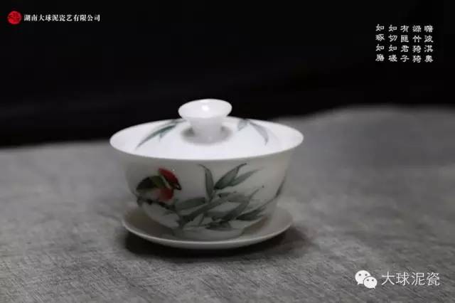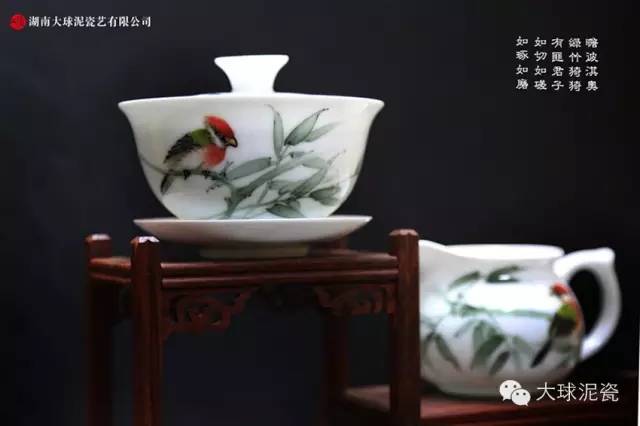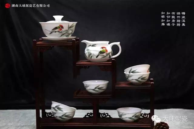 《清香》茶具以大球泥為原料燒制而成,采用釉下五彩工藝裝飾,一如既往地保持了“大球泥瓷”如羊脂玉般“晶瑩潔白、白中泛青、透光透影、溫潤如玉”的特點。以竹葉為素材,仿佛能讓人感覺到一股沁人心脾的味道。竹有十德,外直中通,襟懷若谷,曰虛懷;有花深埋,素面朝天,曰質樸。與茶道中“禪茶一味,道在茶中行”的禪門藝術相呼應,有著感染靈魂的意趣,讓人在輕松和素雅中感悟到生命的精彩和豐富。