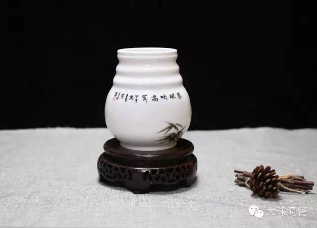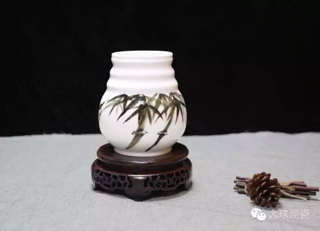 此幅作品設計靈感源自竹節(jié),造型別致,兼具了竹剛直柔韌的神韻與大球泥瓷淡雅脫俗的氣度。整幅畫面構圖簡潔清爽,以清淡雅麗的筆墨畫疏朗清竹兩枝,枝干挺立,葉片參差交錯,通過墨色的濃淡變化顯示出不同的層次。筆墨細膩,風格飄逸,將修竹之挺拔婆娑、堅忍正直之姿,刻畫得生動鮮明,透出一種灑脫之情。