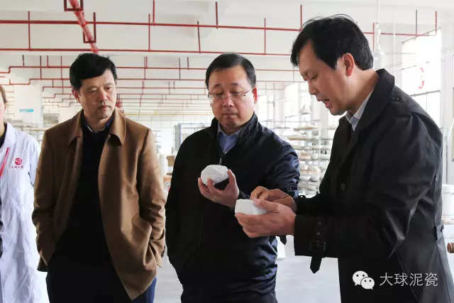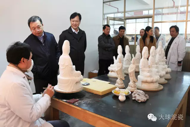 李副廳長一行在公司董事長滕召華的陪同下參觀了大球泥瓷大師原創(chuàng)工作室、釉下繪制工作室、瓷雕創(chuàng)作室、泥料煉制工藝、器型創(chuàng)作工藝、質(zhì)量檢驗區(qū)等。李副廳長對大球泥獨特的制作工藝十分感興趣,還與正在進(jìn)行創(chuàng)作的瓷雕大師、彩繪大師等進(jìn)行了交流;特別是在煉泥區(qū)對一坨坨雪白無暇的大球泥原料感到很是新奇,并對大球泥瓷在經(jīng)歷99道工序后瓷質(zhì)白度達(dá)到92%而贊嘆不已。