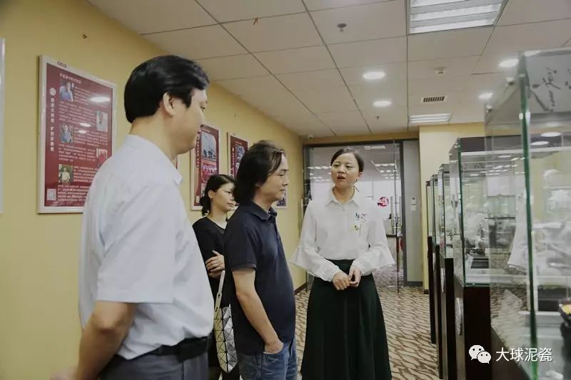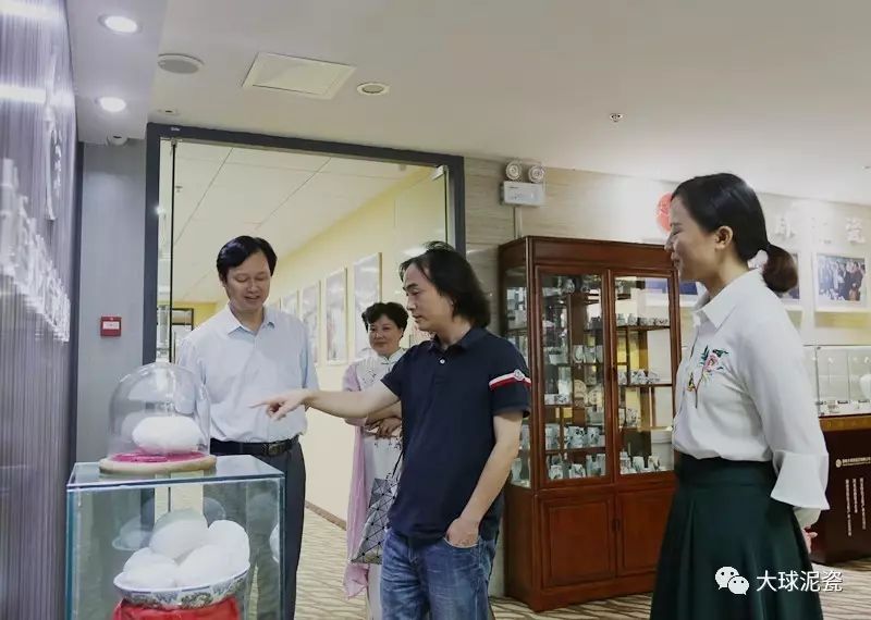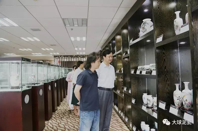 舒勇老師一行在滕董的陪同下參觀了大球泥瓷藝精品展廳,了解了稀缺珍貴的大球泥原料,賞閱了精致如玉的大球泥瓷各系列作品。