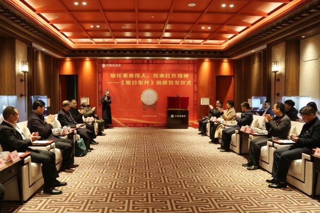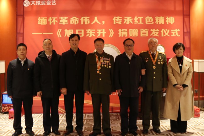 本次活動由湖南大球泥瓷藝有限公司與韶山旅游發(fā)展集團共同主辦,由大球泥瓷藝營銷總監(jiān)姚衛(wèi)主持。滕召華董事長首先說,在偉人誕辰紀念日捐贈《旭日東升》意義非凡,公司成立七年,一直在講好中國故事、傳播紅色文化。這款《旭日東升》以已故著名雕塑家張松鶴創(chuàng)作的毛澤東主席浮雕為原模、以毛澤東故居為背景再創(chuàng)作,全球限量發(fā)售2019枚。隨后,滕董事長鄭重地將編號為0001的《旭日東升》作品呈遞給韶旅集團李飾峰老總手中。李總發(fā)言表示感謝,他說大球泥瓷藝公司很有大愛,這幾年一直堅持捐贈,一直在用藝術作品弘揚偉人精神、傳播紅色文化。