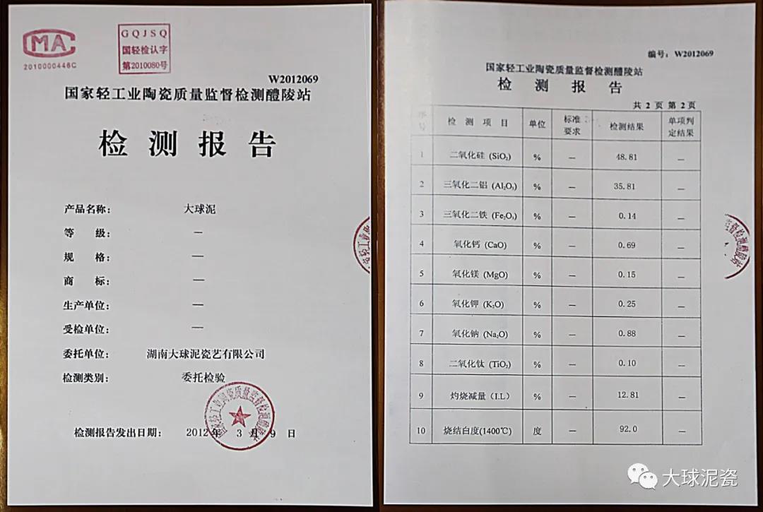“大球泥”一詞最早出現(xiàn)在公眾是2012年1月,2012年3月9日國家輕工業(yè)陶瓷質(zhì)量檢測醴陵站的檢測報告,2012年10月22日百度百科的引用詞條,除此之外,沒有更早的媒體報道有關(guān)“大球泥”了?v觀所有資料來看,“大球泥”有三個注解。