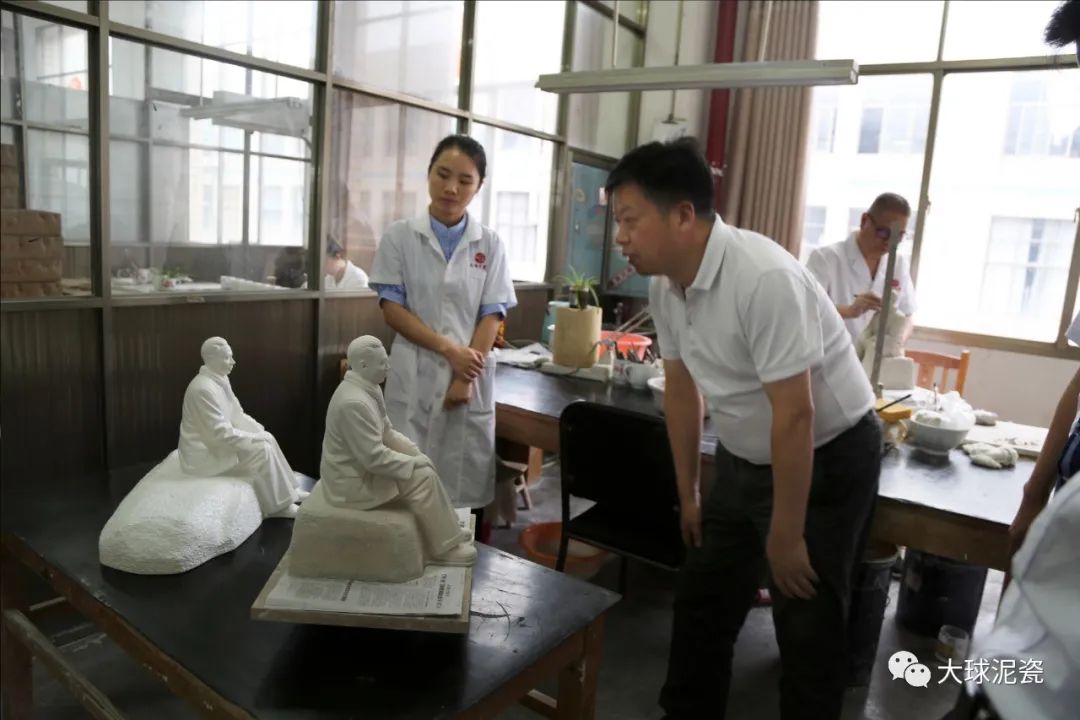 在雕刻創(chuàng)作室,桌上幾尊《劉少奇主席》陶瓷雕塑像,老師在聚精會(huì)神修飾人物的細(xì)節(jié)。聶局長(zhǎng)放慢腳步,輕聲貼近,凝視雕像良久。聶局認(rèn)為,這尊少奇主席的陶瓷雕像,五官端正、神形兼?zhèn)、特征明顯、眉目傳情,這次劉少奇紀(jì)念館與大球泥瓷藝合作一定會(huì)迎來(lái)湖南紅色文化的又一新篇。