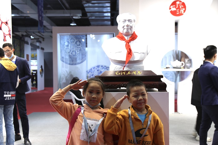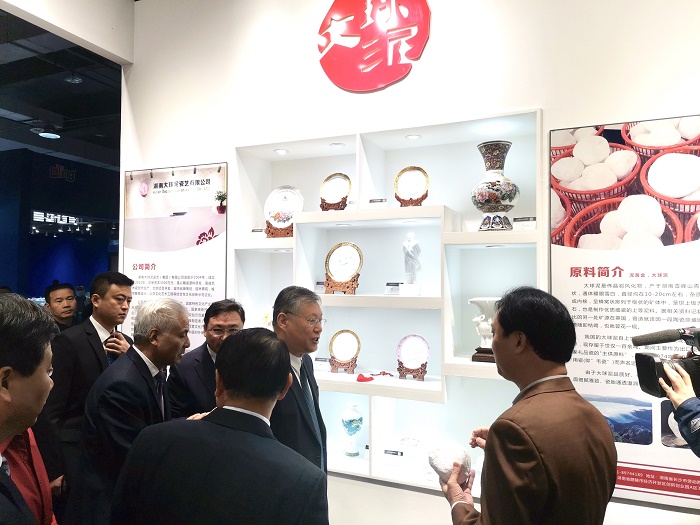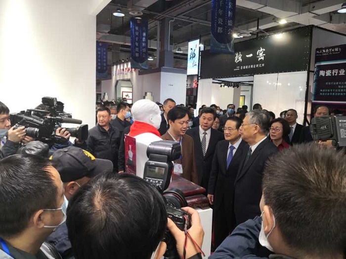 全國政協(xié)副主席劉新成、江西省長易煉紅等領(lǐng)導(dǎo)重點(diǎn)巡視了大球泥瓷藝展館。在《為人民服務(wù)》瓷塑像前,領(lǐng)導(dǎo)們駐足凝視、無限崇敬。滕董事長介紹了這尊毛澤東主席半身雕塑的原創(chuàng)作者、原料配方、制作工藝、高溫承制的艱難過程,重點(diǎn)講解了“毛瓷”的核心原料——大球泥的稀缺性、珍貴性。易省長鼓勵(lì)大球泥做精做美,在景德鎮(zhèn)發(fā)揚(yáng)光大。
