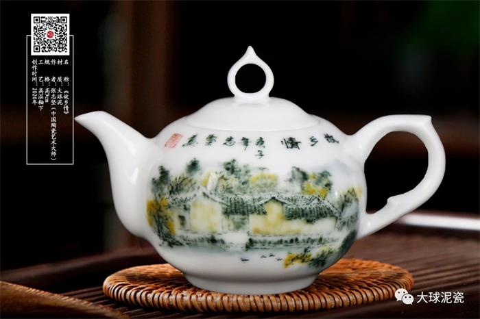 《故鄉(xiāng)情》是由國家正高級工藝美術(shù)師滕召華設計創(chuàng)意、中國陶瓷工藝大師張志堅手繪。作品用劉少奇同志故居為寫實背景,以秋天樹葉金黃為意境,寓意落葉歸根、思念故鄉(xiāng)。作品以珍稀大球泥為原料,運用國家非物質(zhì)文化遺產(chǎn),采用釉下手繪方式,經(jīng)1400度高溫,三次燒制而成,瓷質(zhì)集溫潤、通透、潔白于一體,具有藝術(shù)、非遺、材料等多重價值。
