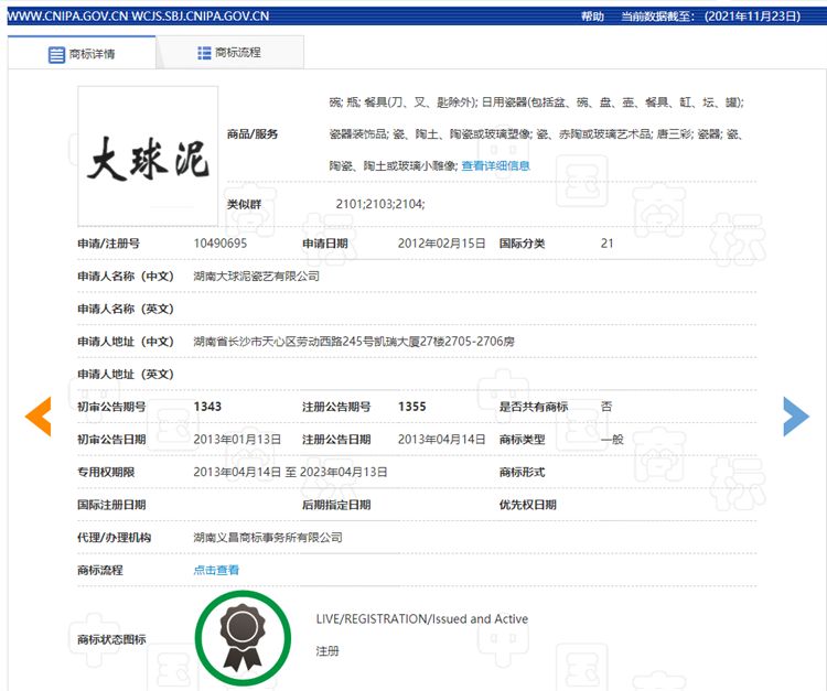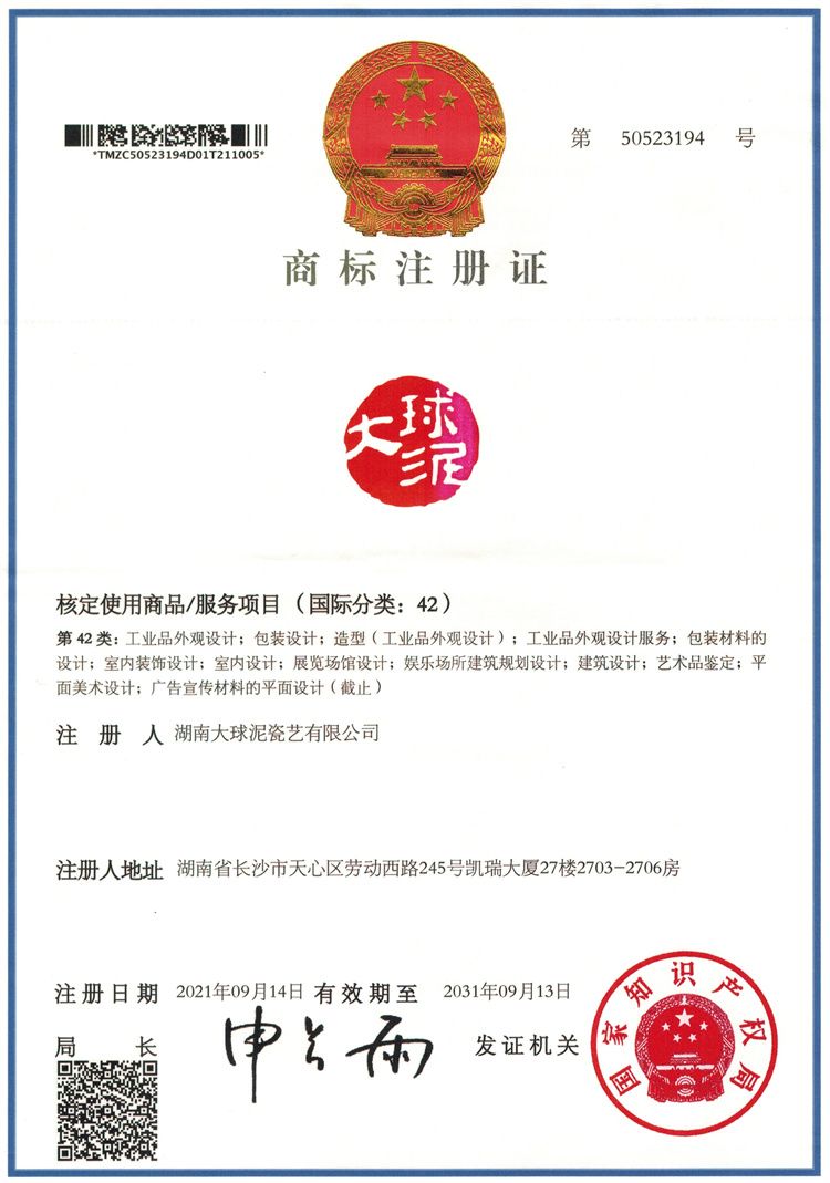 近期,我公司收到國家知識產(chǎn)權(quán)局頒發(fā)的“大球泥”在國際分類42類商標注冊證書,這一注冊商標的啟用,標志著“大球泥”商標不僅在陶瓷器具、廣告宣傳等領(lǐng)域受到保護,而且在建筑施工、工業(yè)設(shè)計等領(lǐng)域也受到保護。