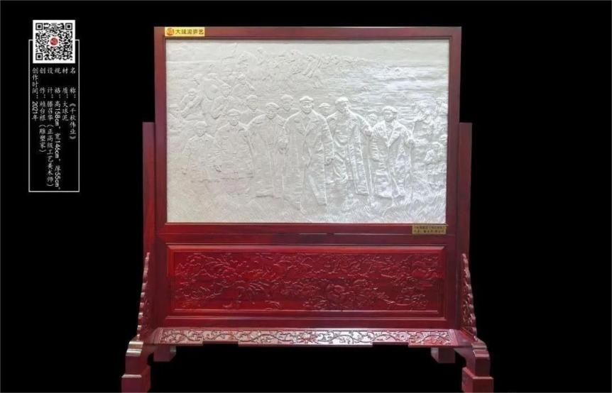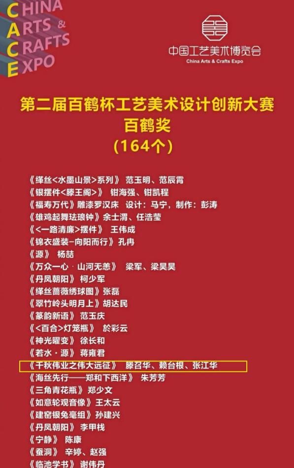 8月18日至21日,第二屆中國(guó)工藝美術(shù)博覽會(huì)在南京國(guó)際博覽中心舉行,來(lái)自全國(guó)46個(gè)地方特色展團(tuán)與1800多家展商計(jì)2萬(wàn)余件作品參加展覽。其中參評(píng)“百鶴杯”作品有3055件/套,大球泥瓷藝的大塊高溫浮雕作品《千秋偉業(yè)之偉大遠(yuǎn)征》榮獲“百鶴獎(jiǎng)”。