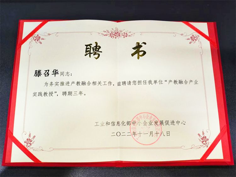 近期,由工業(yè)和信息化部中小企業(yè)發(fā)展促進中心選聘的“產(chǎn)教融合產(chǎn)業(yè)實踐教授(第一批)入庫人員”名單正式公布,公司董事長滕召華獲聘教授,這是新年收到了第一個證書。